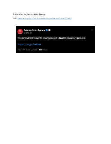 Publication: X – Bahrain News Agency Link: Bahrain News Agency: Tourism Minister meets newly elected UNWTO Secretary General