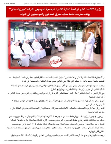ﻦﺸﯿﻧ ﻚﯾزﻮﯿﻣ" ﺔﻛﺮﺸﻟ ﻰﻘﯿﺳﻮﻤﻠﻟ ﺔﯿﻧﺎﺜﻟا ﺔﯿﻋﺎﻤﺠﻟا ةرادﻹا ﺔﺼﺧر ﺢﻨﻣ ﻦﻋ دﺎﺼﺘﻗﻻا ةرازو ﺖﻨﻠﻋأ :2025 ﻮﯿﻧﻮﯾ 3 ،ﻲﺒظﻮﺑأ"