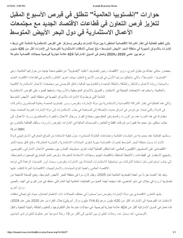 دﯾدﺟﻟا دﺎﺻﺗﻗﻻا تﺎﻋﺎطﻗ ﻲﻓ نوﺎﻌﺗﻟاو شﺎﻘﻧﻟا زﯾزﻌﺗ فدﮭﺑ ،لﺑﻘﻣﻟا عوﺑﺳﻷا صرﺑﻗ ﻲﻓ ﻰﻟوﻷا ﺎﮭﺗرود ﻖﻠطﻧﺗﺳ ﻲﺗﻟاو ،"طﺳوﺗﻣﻟا - ﺎﯾﺑوﺗﺳﻔﻧإ"