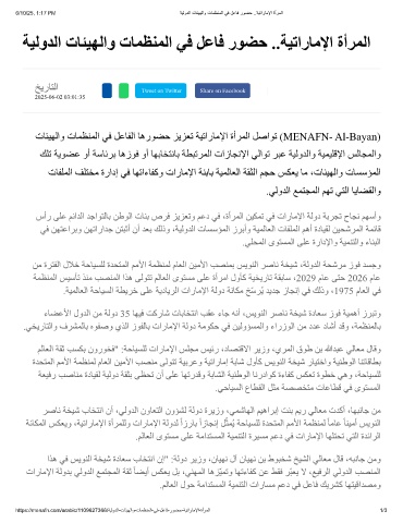 https://menafn.com/arabic/1109627366/ﺔﯾﻟودﻟا-تﺎﺋﯾﮭﻟاو-تﺎﻣظﻧﻣﻟا-ﻲﻓ-لﻋﺎﻓ-روﺿﺣ-ﺔﯾﺗارﺎﻣﻹا-ةأرﻣﻟا 1/3