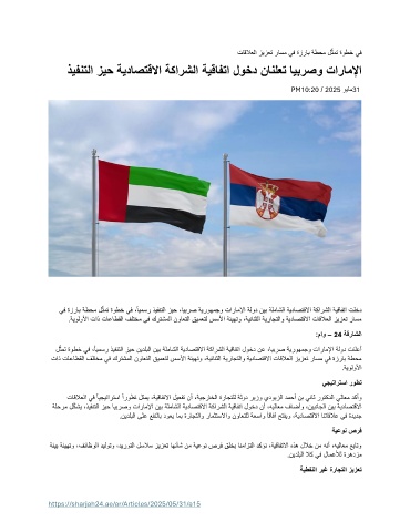 يف ةزراب ةطحم لثمت ةوطخ يف ،ًايمسر ذيفنتلا زيح ،ايبرص ةيروهمجو تاراملإا ةلود نيب ةلماشلا ةيداصتقلاا ةكارشلا ةيقافتا تلخد
