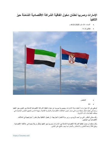 ذيفنتلا زيح نيدلبلا نيب ةلماشلا ةيداصتقلاا ةكارشلا ةيقافتا لوخد نع ايبرص ةيروهمجو تاراملإا ةلود تنلعأ / ماو /ويام 31 يف يبظوبأ