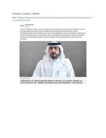 Publication: Facebook – Mid East Link: Mid-East: Statement by H.E. Ahmad Saeed bin Meshar Al Muhairi, SLC Secretary General, on Emirati Women’s Day