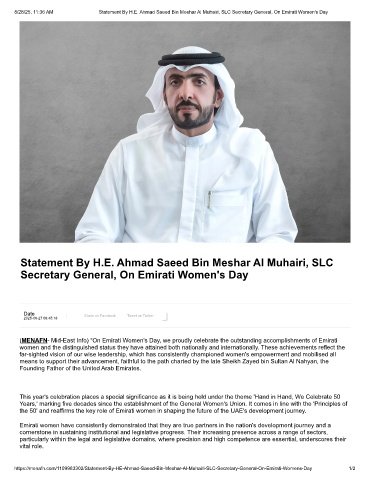 https://menafn.com/1109983302/Statement-By-HE-Ahmad-Saeed-Bin-Meshar-Al-Muhairi-SLC-Secretary-General-On-Emirati-Womens-Day 1/2