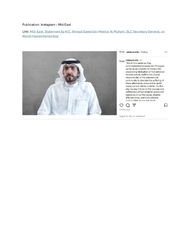 Publication: Instagram – Mid East Link: Mid-East: Statement by H.E. Ahmad Saeed bin Meshar Al Muhairi, SLC Secretary General, on World Humanitarian Day