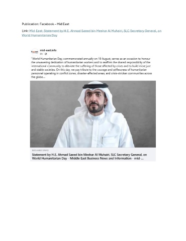 Publication: Facebook – Mid East Link: Mid-East: Statement by H.E. Ahmad Saeed bin Meshar Al Muhairi, SLC Secretary General, on World Humanitarian Day