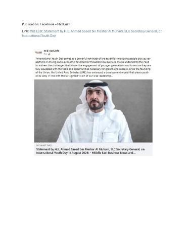 Publication: Facebook – Mid East Link: Mid-East: Statement by H.E. Ahmad Saeed bin Meshar Al Muhairi, SLC Secretary General, on International Youth Day