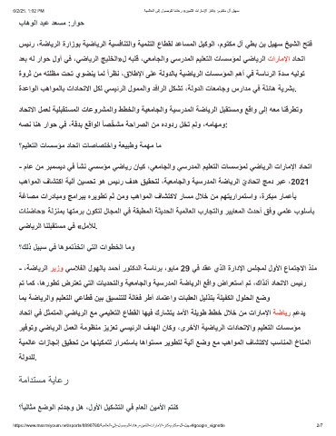 دﻌﺑ ﮫﻟ راوﺣ لوأ ﻲﻓ ،ﻲﺿﺎﯾرﻟا ﺞﯾﻠﺧﻟا»ل ﮫﺑﻠﻗ ،ﻲﻌﻣﺎﺟﻟاو ﻲﺳردﻣﻟا مﯾﻠﻌﺗﻟا تﺎﺳﺳؤﻣﻟ ﻲﺿﺎﯾرﻟا تارﺎﻣﻹا دﺎﺣﺗا