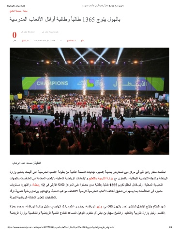 ةرازو مﯾظﻧﺗﺑ تﻣﯾﻗأ ﻲﺗﻟا ﺔﯾﺳردﻣﻟا بﺎﻌﻟﻷا ﺔﻟوطﺑ نﻣ ﺔﯾﻧﺎﺛﻟا ﺔﺧﺳﻧﻟا تﺎﯾﺋﺎﮭﻧ ،وﺑﺳﻛإ ﺔﻧﯾدﻣﺑ ضرﺎﻌﻣﻠﻟ ﻲﺑد زﻛرﻣ ﻲﻓ مﯾﻗأ ﻊﺋار لﻔﺣﺑ تﻣﺗُﺗﺧا
