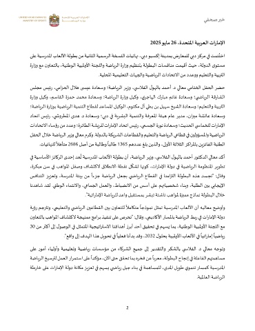 �� ﺔﻴﺳﺎﺳﻷا ﺰﺋﺎ�ﺮﻟا ىﺪﺣإ ﺪﻌ� ﺔﻴﺳرﺪﳌا بﺎﻌﻟﻷا ﺔﻟﻮﻄﺑ نأ ،ﺔﺿﺎ�ﺮﻟا ﺮ�زو ،ي��ﻼﻔﻟا لﻮهﻟﺎﺑ ﺪﻤﺣأ رﻮﺘﻛﺪﻟا ��ﺎﻌﻣ ﺪﻛأ