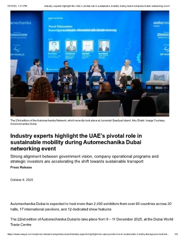 10/10/25, 1:51 PM Industry experts highlight the UAE’s pivotal role in sustainable mobility during Automechanika Dubai networking event