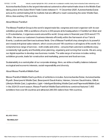 10/10/25, 1:51 PM Industry experts highlight the UAE’s pivotal role in sustainable mobility during Automechanika Dubai networking event