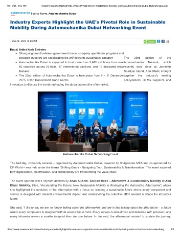 10/10/25, 1:53 PM Industry Experts Highlight the UAE’s Pivotal Role in Sustainable Mobility During Automechanika Dubai Networking Event