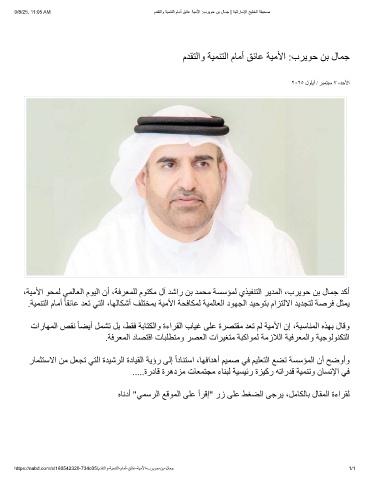 ،ﺔﯿﻣﻷا ﻮﺤﻤﻟ ﻲﻤﻟﺎﻌﻟا مﻮﯿﻟا نأ ،ﺔﻓﺮﻌﻤﻠﻟ مﻮﺘﻜﻣ لآ ﺪﺷار ﻦﺑ ﺪﻤﺤﻣ ﺔﺴﺳﺆﻤﻟ يﺬﯿﻔﻨﺘﻟا ﺮﯾﺪﻤﻟا ،بﺮﯾﻮﺣ ﻦﺑ لﺎﻤﺟ ﺪﻛأ