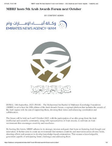 9/15/25, 10:07 AM MBRF hosts 5th Arab Awards Forum next October – UAE Business and Travel Insights – TotalUAE.com
