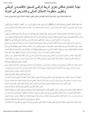 ززﻌﺗ ﺔﻓﺎﻔﺷو ﺔﻧﻣآ ﺔﯾدﺎﺻﺗﻗا ﺔﺋﯾﺑ رﯾﻓوﺗو ،ﺔﻟودﻟا ﻲﻓ ﻲﻌﯾرﺷﺗﻟاو ﻲﻟﺎﻣﻟا لﺎﺛﺗﻣﻻا ﺔﻣوظﻧﻣ رﯾوطﺗ ﻰﻟإ ﺔﯾﻣارﻟا ﺔﯾﻧطوﻟا دوﮭﺟﻟا ﺔﻌﺑﺎﺗﻣ ﺔﻧﺟﻠﻟا تدﻛأو