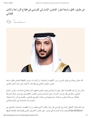 7/17/25, 1:48 PM ﻲﺋاذﻐﻟا نﻣﻷاو ﺔﻋارزﻟا عﺎطﻗ ﻰﻓ ﻲﺳﻧوﺗﻟا ﻲﺗارﺎﻣﻹا نوﺎﻌﺗﻟا ززﻌﺗ ﺔﻌﺳاو قﺎﻓآ :قوط نﺑا