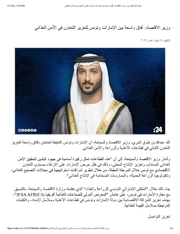 7/17/25, 1:50 PM ﻲﺋاذﻐﻟا نﻣﻷا ﻲﻓ نوﺎﻌﺗﻟا زﯾزﻌﺗﻟ سﻧوﺗو تارﺎﻣﻹا نﯾﺑ ﺔﻌﺳاو قﺎﻓآ :دﺎﺻﺗﻗﻻا رﯾزو | يرﺎﺑﺧﻹا 24 ﻊﻗوﻣ