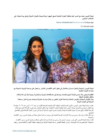 ىلع ةزفحم ةئيب ريفوتو ةيلودلا ةراجتلاب ةحايسلا طبرل دوهجلا قيسنت ةيملاعلا ةراجتلا ةمظنمل ماعلا ريدملا عم ثحبت سيونلا ةخيش