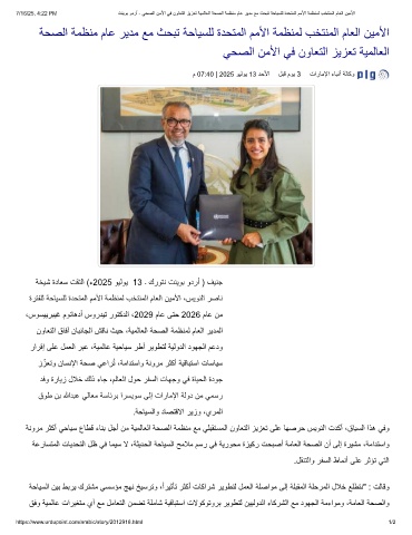 7/16/25, 4:22 PM تﻧﯾوﺑ ودرأ - ﻲﺣﺻﻟا نﻣﻷا ﻲﻓ نوﺎﻌﺗﻟا زﯾزﻌﺗ ﺔﯾﻣﻟﺎﻌﻟا ﺔﺣﺻﻟا ﺔﻣظﻧﻣ مﺎﻋ رﯾدﻣ ﻊﻣ ثﺣﺑﺗ ﺔﺣﺎﯾﺳﻠﻟ ةدﺣﺗﻣﻟا مﻣﻷا ﺔﻣظﻧﻣﻟ بﺧﺗﻧﻣﻟا مﺎﻌﻟا نﯾﻣﻷا
