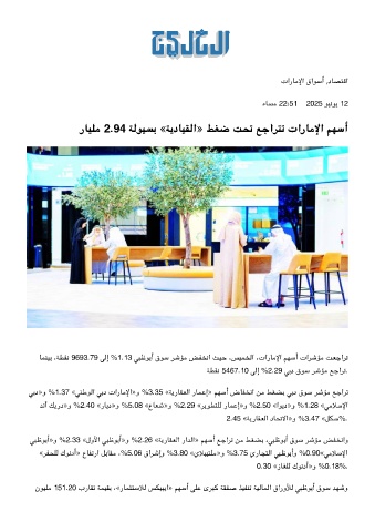 ﺑد»و %1.37 «ﻨﻃﻮﻟا ﺑد تارﺎﻣﻹا»و %3.35 «ﺔﻳرﺎﻘﻌﻟا رﺎﻤﻋإ» ﻢﻬﺳأ ضﺎﻔﺨﻧا ﻦﻣ ﻂﻐﻀﺑ ﺑد قﻮﺳ ﺮﺷﺆﻣ ﻊﺟاﺮﺗ