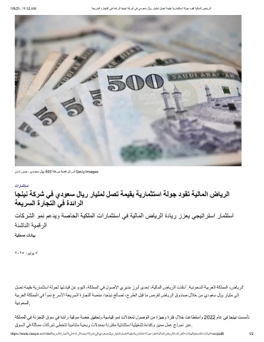 7/8/25, 11:12 AM ﺔﻌﯾرﺳﻟا ةرﺎﺟﺗﻟا ﻲﻓ ةدﺋارﻟا ﺎﺟﻧﯾﻧ ﺔﻛرﺷ ﻲﻓ يدوﻌﺳ ﷼ رﺎﯾﻠﻣﻟ لﺻﺗ ﺔﻣﯾﻘﺑ ﺔﯾرﺎﻣﺛﺗﺳا ﺔﻟوﺟ دوﻘﺗ ﺔﯾﻟﺎﻣﻟا ضﺎﯾرﻟا