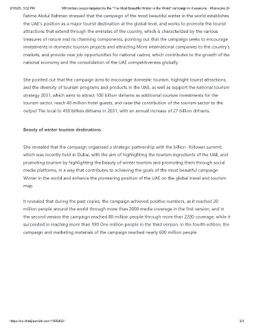 2/18/25, 3:52 PM 900 million people targeted by the “The Most Beautiful Winter in the World” campaign in 4 sessions - Khaleejion 24