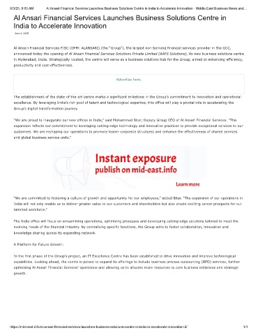 6/3/25, 9:05 AM Al Ansari Financial Services Launches Business Solutions Centre in India to Accelerate Innovation - Middle East Business News and…