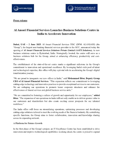 opening of Al Ansari Financial Services Solutions Private Limited (AAFS Solutions), its new