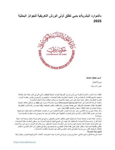 ةلماكتم لمع ةطخ راطإ يف يتأت يتلاو ، 2025 ةيثحبلا زئاوجلل ةيفيرعتلا شرولا ىلوأ يبد ةموكحل ةيرشبلا دراوملا ةرئاد تقلطأ