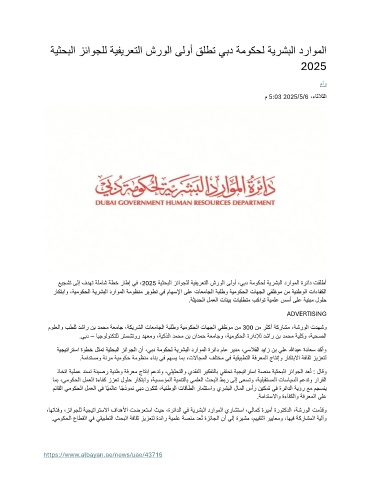 عيجشت ىلإ فدهت ةلماش ةطخ راطإ يف ، 2025 ةيثحبلا زئاوجلل ةيفيرعتلا شرولا ىلوأ ،يبد ةموكحل ةيرشبلا دراوملا ةرئاد تقلطأ