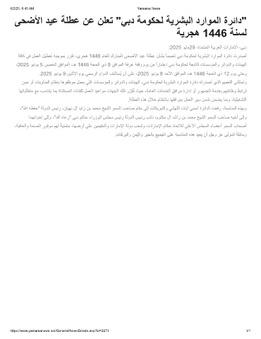 ﻰﺣﺿﻷا دﯾﻋ ﺔﻠطﻋ نﻋ نﻠﻌﺗ "ﻲﺑد ﺔﻣوﻛﺣﻟ ﺔﯾرﺷﺑﻟا دراوﻣﻟا ةرﺋاد"
