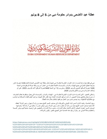 ررقت ،ةيرجه 1446 ماعلل كرابملا ىحضلأا ديع ةلطع نأشب ًاميمعت يبد ةموكحل ةيرشبلا دراوملا ةرئاد تردصأ /ماو /ويام 29 يف يبد