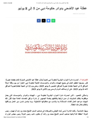 ،ﺔﯾﺮﺠھ 1446 مﺎﻌﻠﻟ كرﺎﺒﻤﻟا ﻰﺤﺿﻷا ﺪﯿﻋ ﺔﻠﻄﻋ نﺄﺸﺑ ًﺎﻤﯿﻤﻌﺗ ﻲﺑد ﺔﻣﻮﻜﺤﻟ ﺔﯾﺮﺸﺒﻟا دراﻮﻤﻟا ةﺮﺋاد ترﺪﺻأ - 7 تارﺎﻣﻻا
