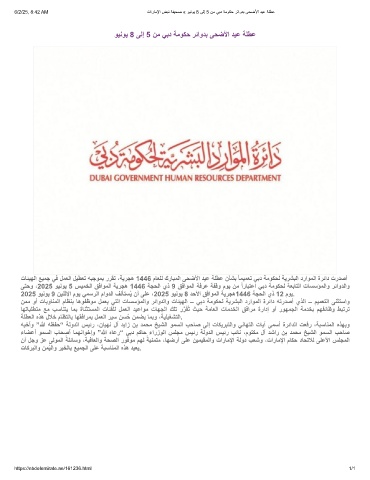 تﺎﺋﯾﮭﻟا ﻊﯾﻣﺟ ﻲﻓ لﻣﻌﻟا لﯾطﻌﺗ ﮫﺑﺟوﻣﺑ ررﻘﺗ ،ﺔﯾرﺟھ 1446 مﺎﻌﻠﻟ كرﺎﺑﻣﻟا ﻰﺣﺿﻷا دﯾﻋ ﺔﻠطﻋ نﺄﺷﺑ ًﺎﻣﯾﻣﻌﺗ ﻲﺑد ﺔﻣوﻛﺣﻟ ﺔﯾرﺷﺑﻟا دراوﻣﻟا ةرﺋاد تردﺻأ