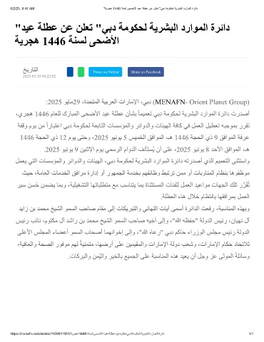 6/2/25, 8:41 AM "ﺔﯾرﺟھ 1446 ﺔﻧﺳﻟ ﻰﺣﺿﻷا دﯾﻋ ﺔﻠطﻋ نﻋ نﻠﻌﺗ "ﻲﺑد ﺔﻣوﻛﺣﻟ ﺔﯾرﺷﺑﻟا دراوﻣﻟا ةرﺋاد