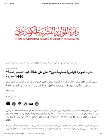 6/2/25, 8:40 AM "ﺔﯾرﺟھ 1446 ﺔﻧﺳﻟ ﻰﺣﺿﻷا دﯾﻋ ﺔﻠطﻋ نﻋ نﻠﻌﺗ "ﻲﺑد ﺔﻣوﻛﺣﻟ ﺔﯾرﺷﺑﻟا دراوﻣﻟا ةرﺋاد