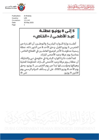 Publication: Al Khaleej Country: UAE Circulation: 121,141 Date: 30 May 2025 Page: 1