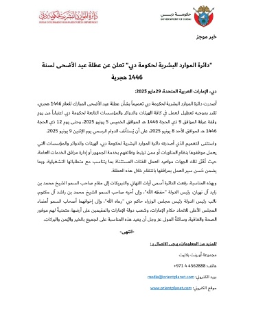 ، ي ﺮﺠﻫ 1446 مﺎﻌﻠ ﻟ كرﺎﺒﻤﻟا ﻰﺤﺿﻷا ﺪﻴﻋ ﺔﻠﻄﻋ نﺄﺸﺑ ًﺎﻤﻴﻤﻌﺗ ي ﺑد ﺔﻣﻮﻜﺤﻟ ﺔﻳﺮﺸﺒﻟا دراﻮﻤﻟا ةﺮﺋاد ترﺪﺻأ