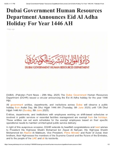 6/2/25, 4:17 PM Dubai Government Human Resources Department Announces Eid Al Adha Holiday For Year 1446 AH | Pakistan Point