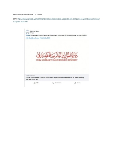 Publication: Facebook – Al Etihad Link: AL ETIHAD: Dubai Government Human Resources Department announces Eid Al Adha holiday for year 1446 AH