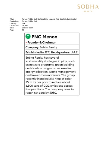 Title: Forbes Middle East Sustainability Leaders, Real Estate & Construction Publication: Forbes Middle East Country: UAE Circulation: 25,000 Date: October 2024 Page: 71