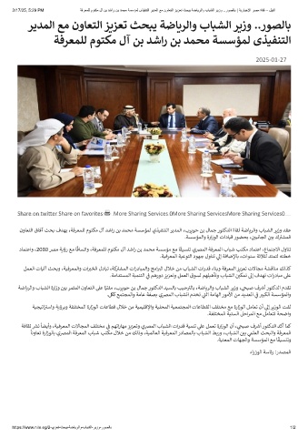 2/17/25, 5:29 PM ﺔﻓرﻌﻣﻠﻟ موﺗﻛﻣ لآ نﺑ دﺷار نﺑ دﻣﺣﻣ ﺔﺳﺳؤﻣﻟ ىذﯾﻔﻧﺗﻟا رﯾدﻣﻟا ﻊﻣ نوﺎﻌﺗﻟا زﯾزﻌﺗ ثﺣﺑﯾ ﺔﺿﺎﯾرﻟاو بﺎﺑﺷﻟا رﯾزو ..روﺻﻟﺎﺑ | ﺔﯾرﺎﺑﺧﻹا رﺻﻣ ةﺎﻧﻗ – لﯾﻧﻟا
