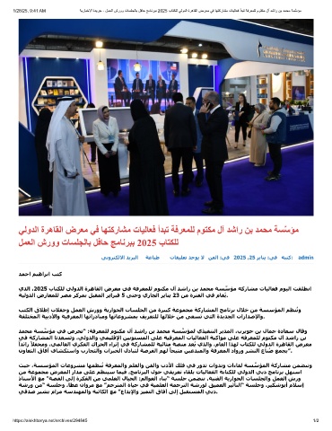 1/28/25, 9:41 AM ﺔﯾرﺎﺑﺧﻻا ةدﯾرﺟ - لﻣﻌﻟا شروو تﺎﺳﻠﺟﻟﺎﺑ لﻓﺎﺣ ﺞﻣﺎﻧرﺑﺑ 2025 بﺎﺗﻛﻠﻟ ﻲﻟودﻟا ةرھﺎﻘﻟا ضرﻌﻣ ﻲﻓ ﺎﮭﺗﻛرﺎﺷﻣ تﺎﯾﻟﺎﻌﻓ أدﺑﺗ ﺔﻓرﻌﻣﻠﻟ موﺗﻛﻣ لآ دﺷار نﺑ دﻣﺣﻣ ﺔﺳﱠﺳؤﻣ