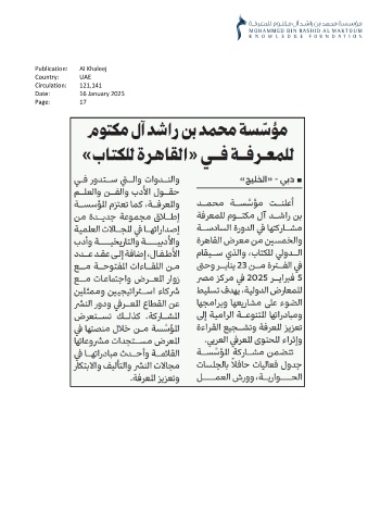 Publication: Al Khaleej Country: UAE Circulation: 121,141 Date: 16 January 2025 Page: 17