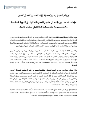ي ﻓ ﺎﻬﺘﻛرﺎﺸﻣ ﺔﻓﺮﻌﻤﻠﻟ مﻮﺘﻜﻣ لآ ﺪﺷار ﻦﺑ ﺪﻤﺤﻣ ﺔﺴﺳﺆﻣ ﺖﻨﻠﻋأ - 2025 ﺮﻳﺎﻨﻳ 15 ، ةﺪﺤﺘﻤﻟا ﺔﻴﺑﺮﻌﻟا تارﺎﻣﻹا ،ي ﺑد