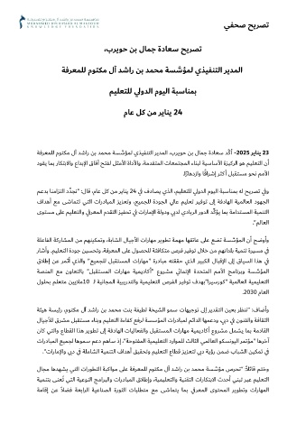 ﻢﻋﺪﺑ ﺎﻨﻣاﺰﺘﻟا د �ﺪﺠﻧ" :لﺎﻗ ،مﺎﻋ ﻞﻛ ﻦﻣ ﺮﻳﺎﻨﻳ 24 ي ﻓ فدﺎﺼﻳ يﺬﻟا ،ﻢﻴﻠﻌﺘﻠﻟ يﻟوﺪﻟا مﻮﻴﻟا ﺔﺒﺳﺎﻨﻤﺑ ﻪﻟ ﺢﻳﺮﺼﺗ ي ﻓو