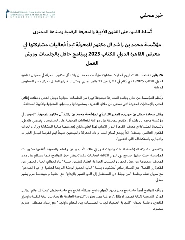 ةﺮﻫﺎﻘﻟا ضﺮﻌﻣ ي ﻓ ﺔﻓﺮﻌﻤﻠﻟ مﻮﺘﻜﻣ لآ ﺪﺷار ﻦﺑ ﺪﻤﺤﻣ ﺔﺴﺳﺆﻣ ﺔﻛرﺎﺸﻣ تﺎﻴﻟﺎﻌﻓ مﻮﻴﻟا ﺖﻘﻠﻄﻧا - 2025 ﺮﻳﺎﻨﻳ 24