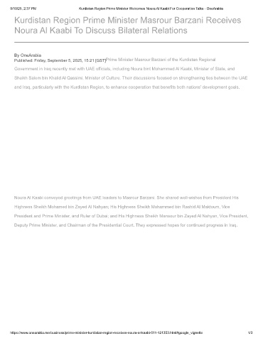 9/10/25, 2:37 PM Kurdistan Region Prime Minister Welcomes Noura Al Kaabi For Cooperation Talks - OneArabia