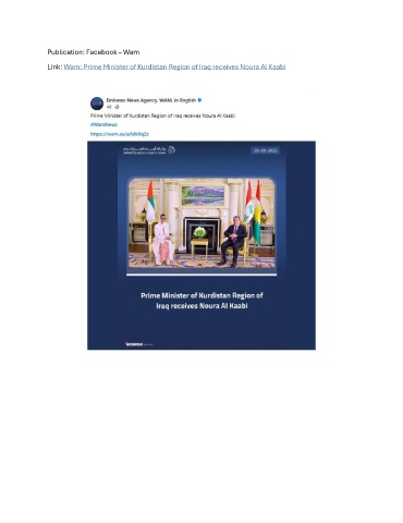 Publication: Facebook – Wam Link: Wam: Prime Minister of Kurdistan Region of Iraq receives Noura Al Kaabi